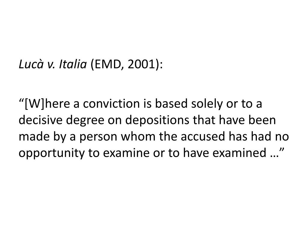 Lucà v. Italia (EMD, 2001): “[W]here a conviction is based solely or to a decisive degree on depositions that have been made by a person whom the accused has had no opportunity to examine or to have examined …”