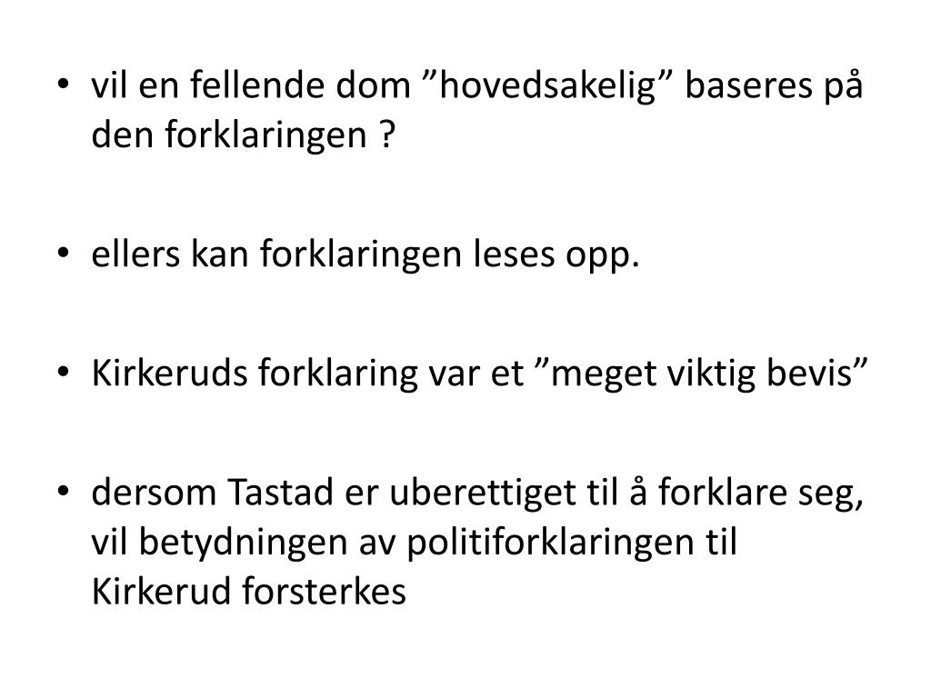 vil en fellende dom ”hovedsakelig” baseres på den forklaringen ? • ellers kan forklaringen leses opp. • Kirkeruds forklaring var et ”meget viktig bevis” • dersom Tastad er uberettiget til å forklare seg, vil betydningen av politiforklaringen til Kirkerud forsterkes
