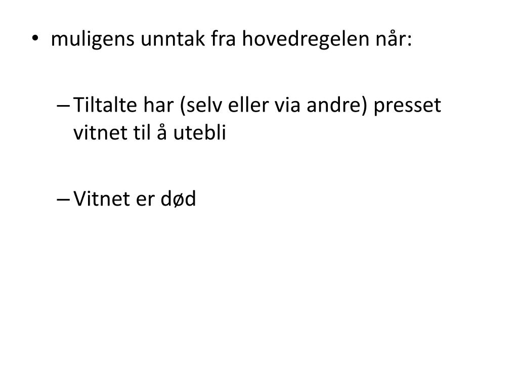 muligens unntak fra hovedregelen når: • Tiltalte har (selv eller via andre) presset vitnet til å utebli • Vitnet er død