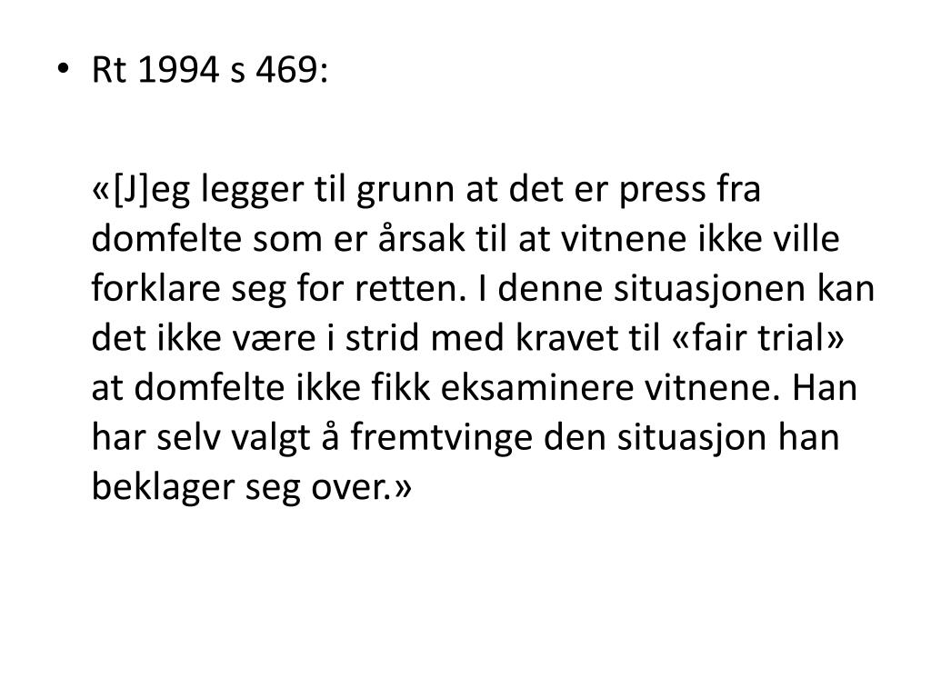 Rt 1994 s 469: «[J]eg legger til grunn at det er press fra domfelte som er årsak til at vitnene ikke ville forklare seg for retten. I denne situasjonen kan det ikke være i strid med kravet til «fair trial» at domfelte ikke fikk eksaminere vitnene. Han har selv valgt å fremtvinge den situasjon han beklager seg over.»