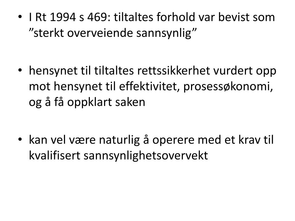 I Rt 1994 s 469: tiltaltes forhold var bevist som ”sterkt overveiende sannsynlig” • hensynet til tiltaltes rettssikkerhet vurdert opp mot hensynet til effektivitet, prosessøkonomi, og å få oppklart saken • kan vel være naturlig å operere med et krav til kvalifisert sannsynlighetsovervekt