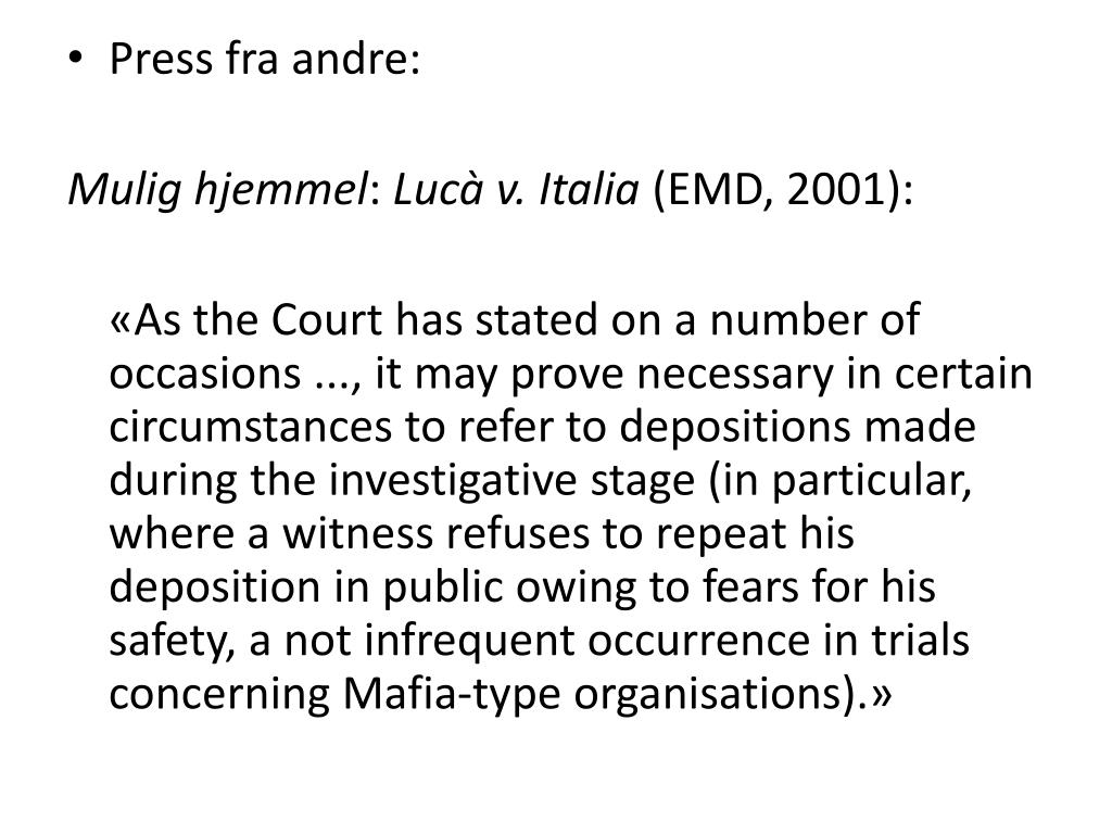 Press fra andre: Mulighjemmel: Lucà v. Italia (EMD, 2001): «As the Court has stated on a number of occasions ..., it may prove necessary in certain circumstances to refer to depositions made during the investigative stage (in particular, where a witness refuses to repeat his deposition in public owing to fears for his safety, a not infrequent occurrence in trials concerning Mafia-type organisations).»