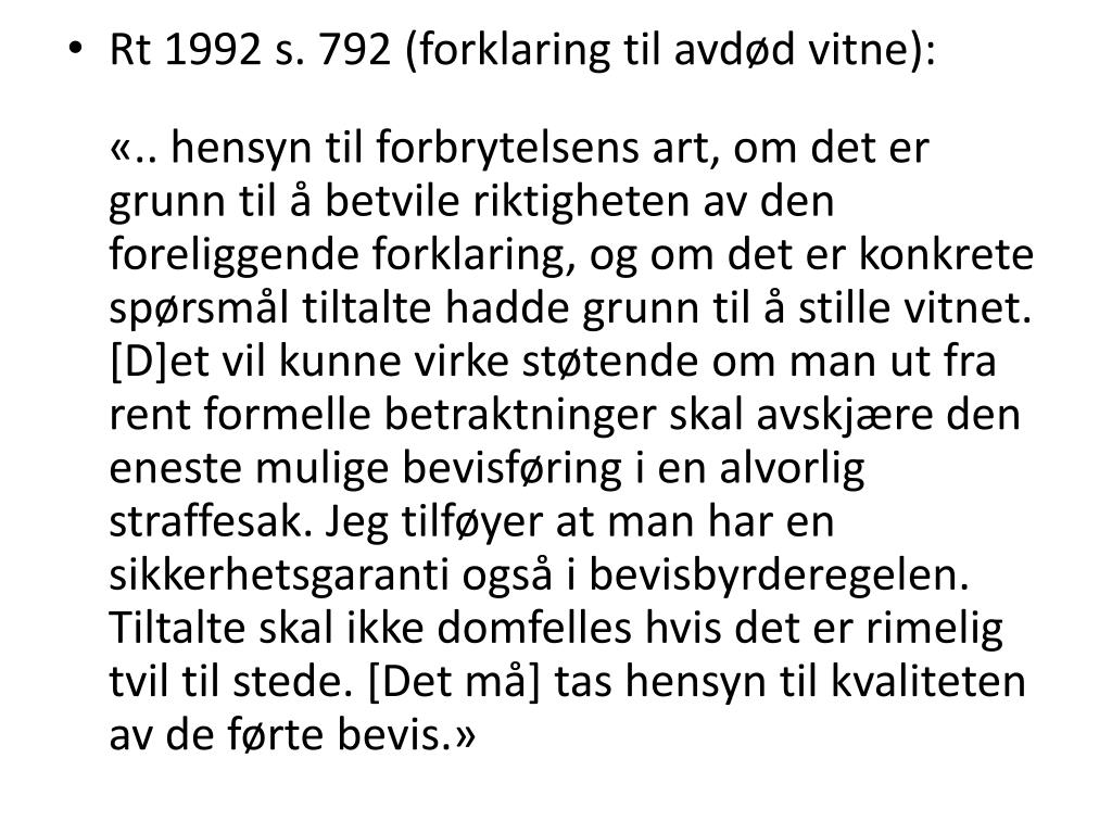 Rt 1992 s. 792 (forklaring til avdød vitne): «.. hensyn til forbrytelsens art, om det er grunn til å betvile riktigheten av den foreliggende forklaring, og om det er konkrete spørsmål tiltalte hadde grunn til å stille vitnet. [D]et vil kunne virke støtende om man ut fra rent formelle betraktninger skal avskjære den eneste mulige bevisføring i en alvorlig straffesak. Jeg tilføyer at man har en sikkerhetsgaranti også i bevisbyrderegelen. Tiltalte skal ikke domfelles hvis det er rimelig tvil til stede. [Det må] tas hensyn til kvaliteten av de førte bevis.»