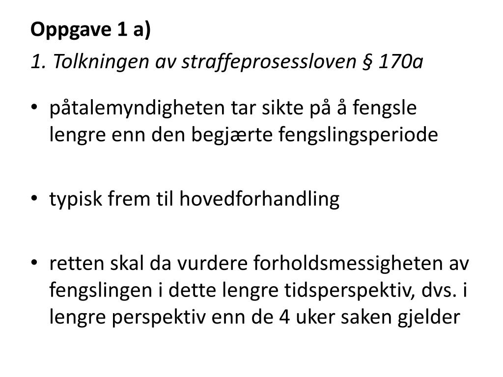 Oppgave 1 a) 1. Tolkningen av straffeprosessloven § 170a • påtalemyndigheten tar sikte på å fengsle lengre enn den begjærte fengslingsperiode • typisk frem til hovedforhandling • retten skal da vurdere forholdsmessigheten av fengslingen i dette lengre tidsperspektiv, dvs. i lengre perspektiv enn de 4 uker saken gjelder