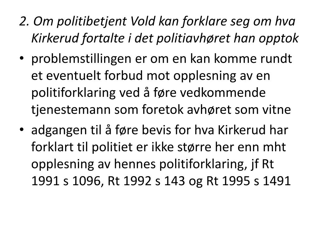2. Om politibetjent Vold kan forklare seg om hva Kirkerud fortalte i det politiavhøret han opptok • problemstillingen er om en kan komme rundt et eventuelt forbud mot opplesning av en politiforklaring ved å føre vedkommende tjenestemann som foretok avhøret som vitne • adgangen til å føre bevis for hva Kirkerud har forklart til politiet er ikke større her enn mht opplesning av hennes politiforklaring, jf Rt 1991 s 1096, Rt 1992 s 143 og Rt 1995 s 1491