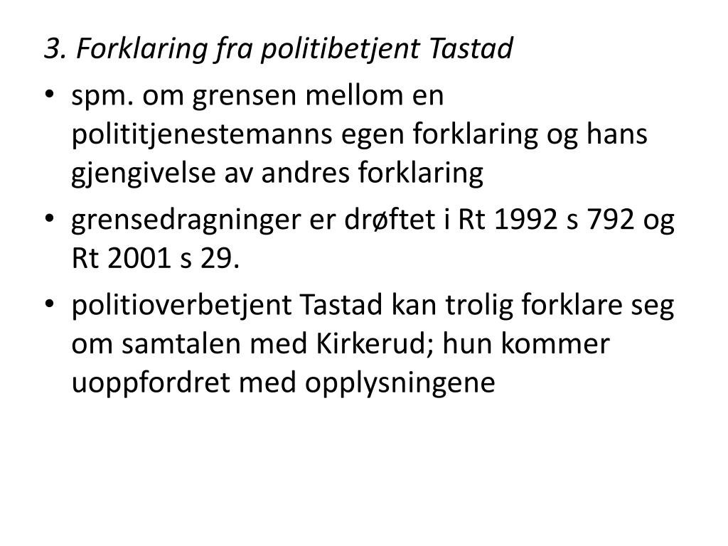 3. Forklaring fra politibetjent Tastad • spm. om grensen mellom en polititjenestemanns egen forklaring og hans gjengivelse av andres forklaring • grensedragninger er drøftet i Rt 1992 s 792 og Rt 2001 s 29. • politioverbetjent Tastad kan trolig forklare seg om samtalen med Kirkerud; hun kommer uoppfordret med opplysningene