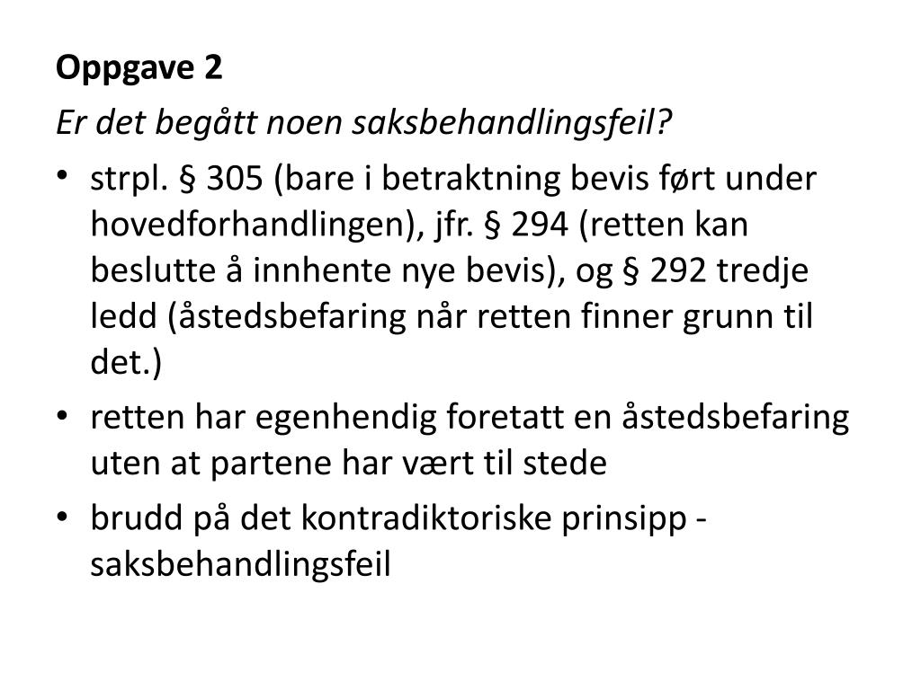 Oppgave 2 Er det begått noen saksbehandlingsfeil? • strpl. § 305 (bare i betraktning bevis ført under hovedforhandlingen), jfr. § 294 (retten kan beslutte å innhente nye bevis), og § 292 tredje ledd (åstedsbefaring når retten finner grunn til det.) • retten har egenhendig foretatt en åstedsbefaring uten at partene har vært til stede • brudd på det kontradiktoriske prinsipp - saksbehandlingsfeil