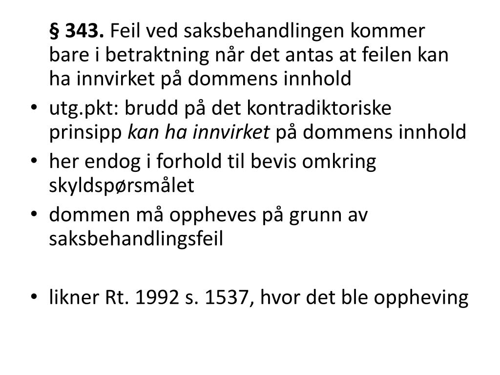 § 343. Feil ved saksbehandlingen kommer bare i betraktning når det antas at feilen kan ha innvirket på dommens innhold • utg.pkt: brudd på det kontradiktoriske prinsipp kan ha innvirket på dommens innhold • her endog i forhold til bevis omkring skyldspørsmålet • dommen må oppheves på grunn av saksbehandlingsfeil • likner Rt. 1992 s. 1537, hvor det ble oppheving