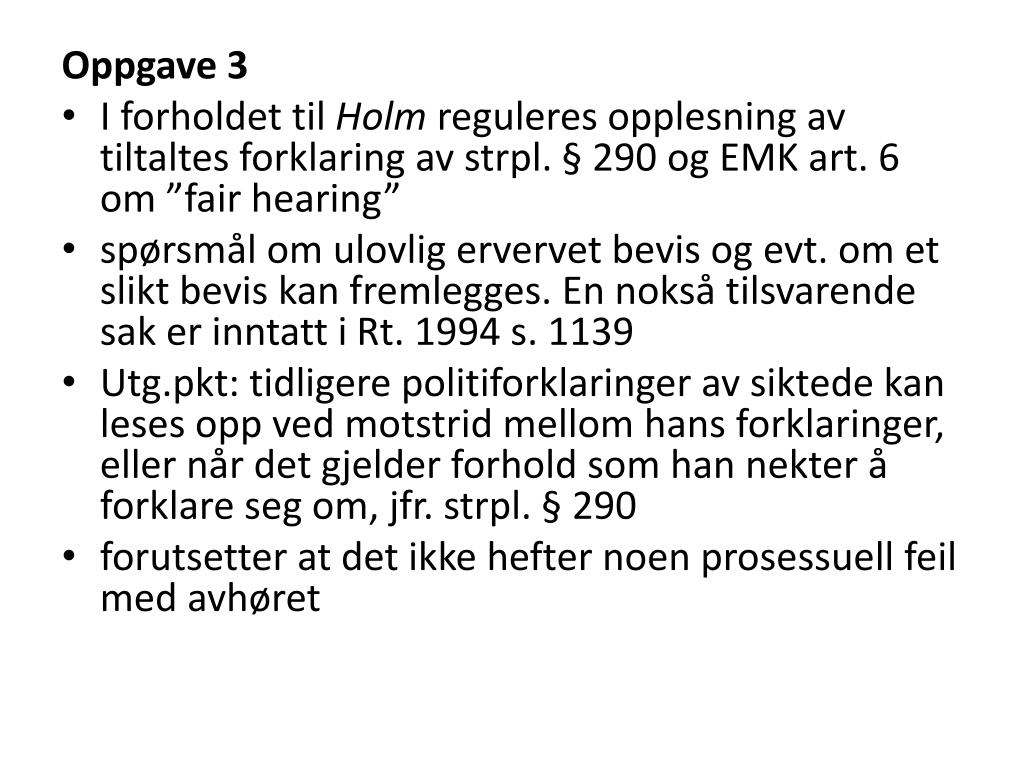 Oppgave 3 • I forholdet til Holm reguleres opplesning av tiltaltes forklaring av strpl. § 290 og EMK art. 6 om ”fair hearing” • spørsmål om ulovlig ervervet bevis og evt. om et slikt bevis kan fremlegges. En nokså tilsvarende sak er inntatt i Rt. 1994 s. 1139 • Utg.pkt: tidligere politiforklaringer av siktede kan leses opp ved motstrid mellom hans forklaringer, eller når det gjelder forhold som han nekter å forklare seg om, jfr. strpl. § 290 • forutsetter at det ikke hefter noen prosessuell feil med avhøret