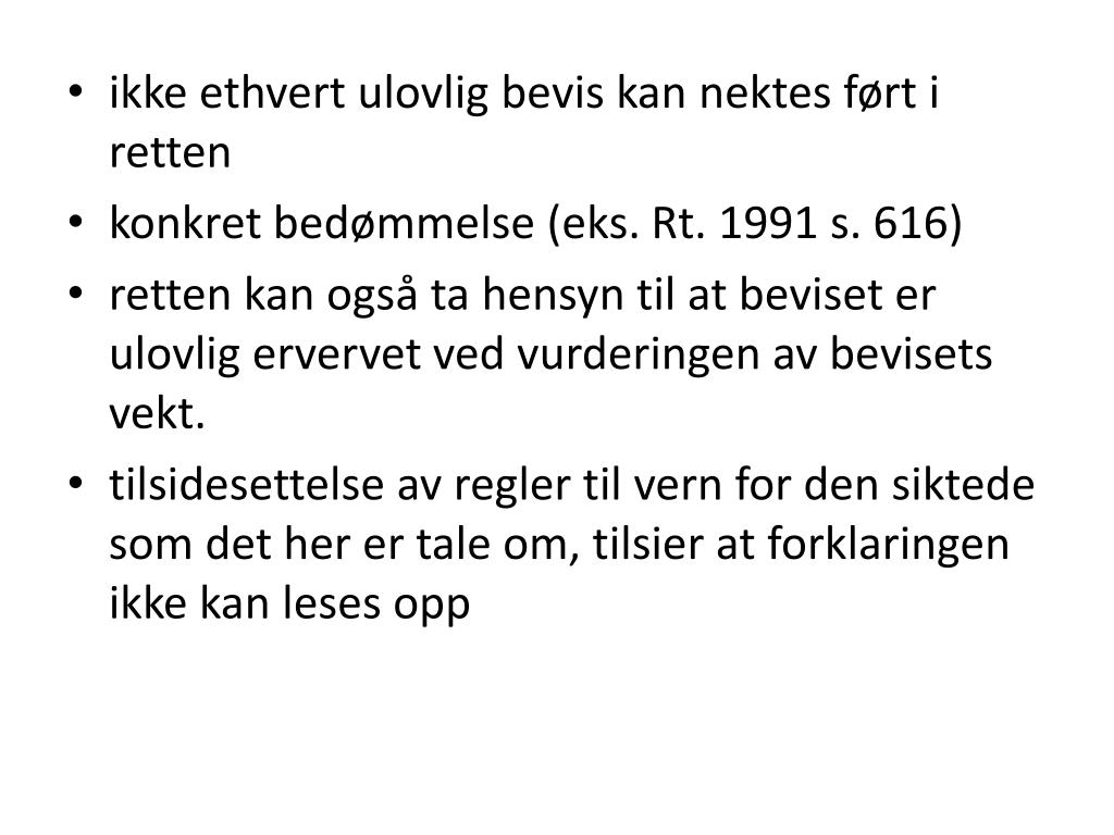 ikke ethvert ulovlig bevis kan nektes ført i retten • konkret bedømmelse (eks. Rt. 1991 s. 616) • retten kan også ta hensyn til at beviset er ulovlig ervervet ved vurderingen av bevisets vekt. • tilsidesettelse av regler til vern for den siktede som det her er tale om, tilsier at forklaringen ikke kan leses opp