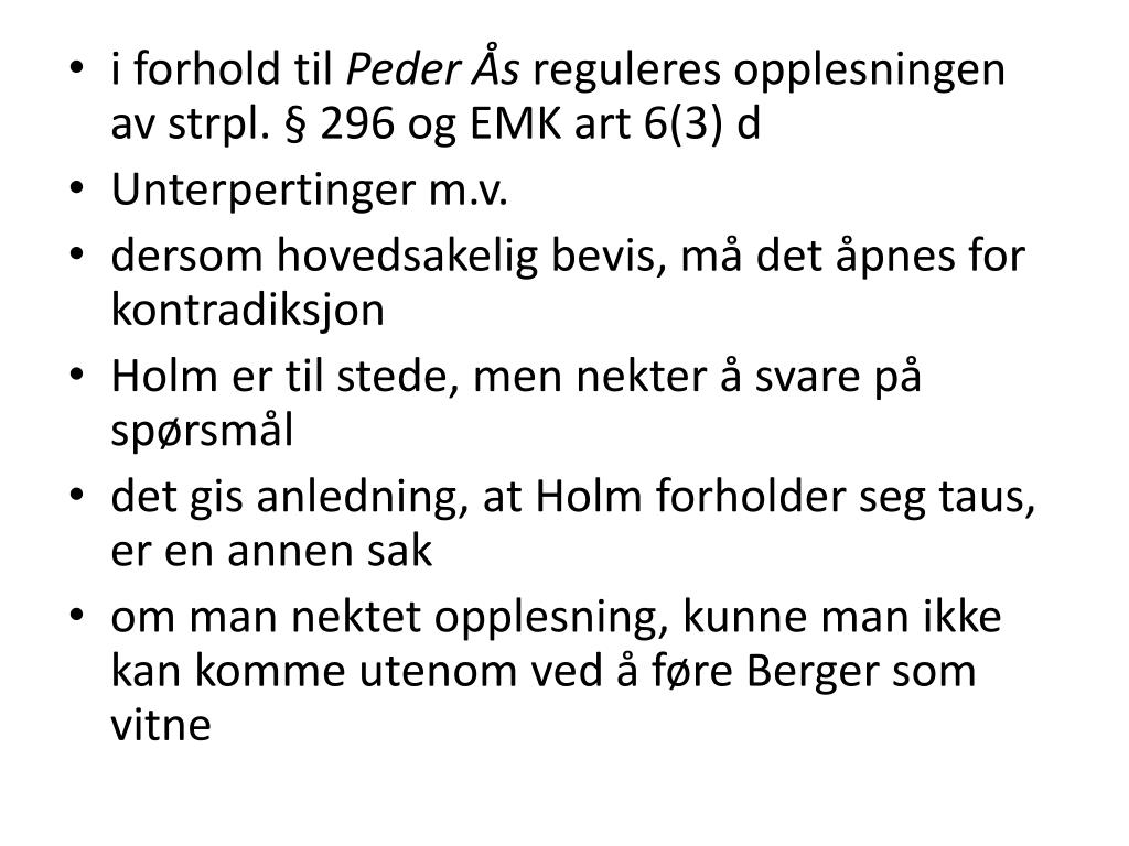 i forhold til Peder Ås reguleres opplesningen av strpl. § 296 og EMK art 6(3) d • Unterpertinger m.v. • dersom hovedsakelig bevis, må det åpnes for kontradiksjon • Holm er til stede, men nekter å svare på spørsmål • det gis anledning, at Holm forholder seg taus, er en annen sak • om man nektet opplesning, kunne man ikke kan komme utenom ved å føre Berger som vitne
