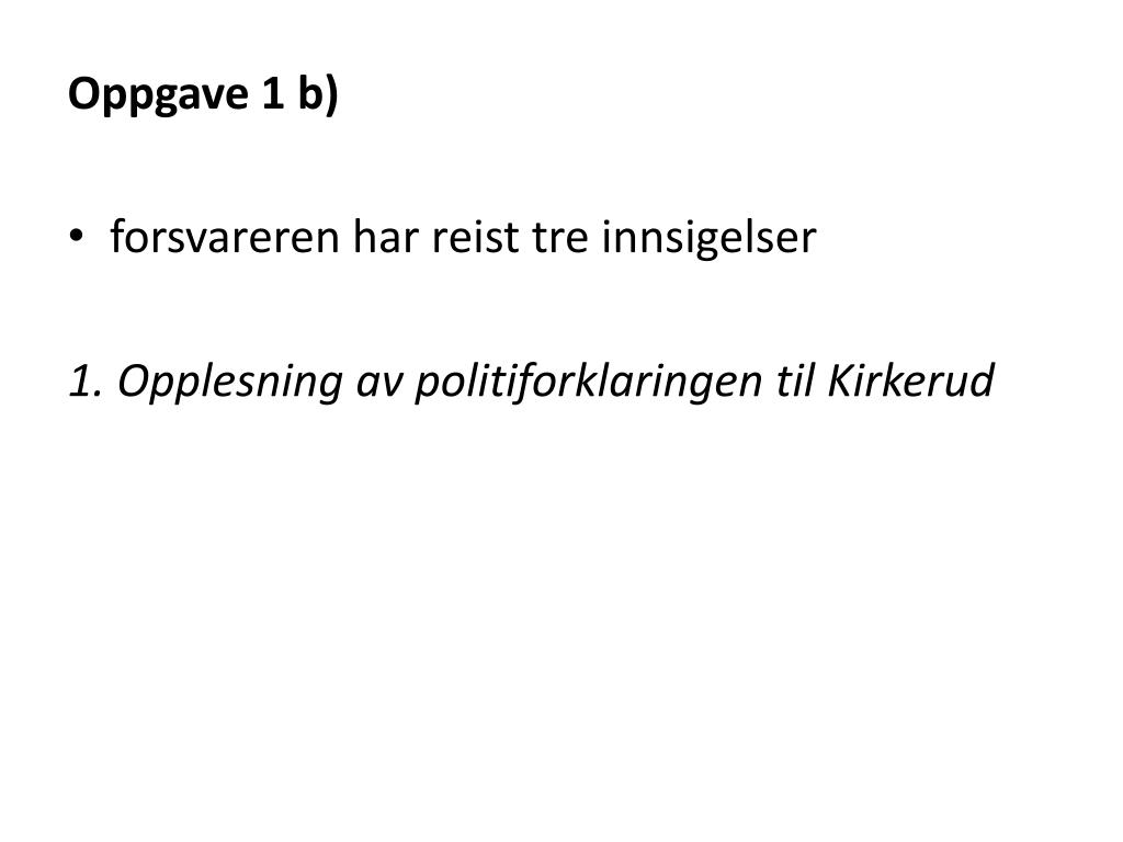 Oppgave 1 b) • forsvareren har reist tre innsigelser 1. Opplesning av politiforklaringen til Kirkerud
