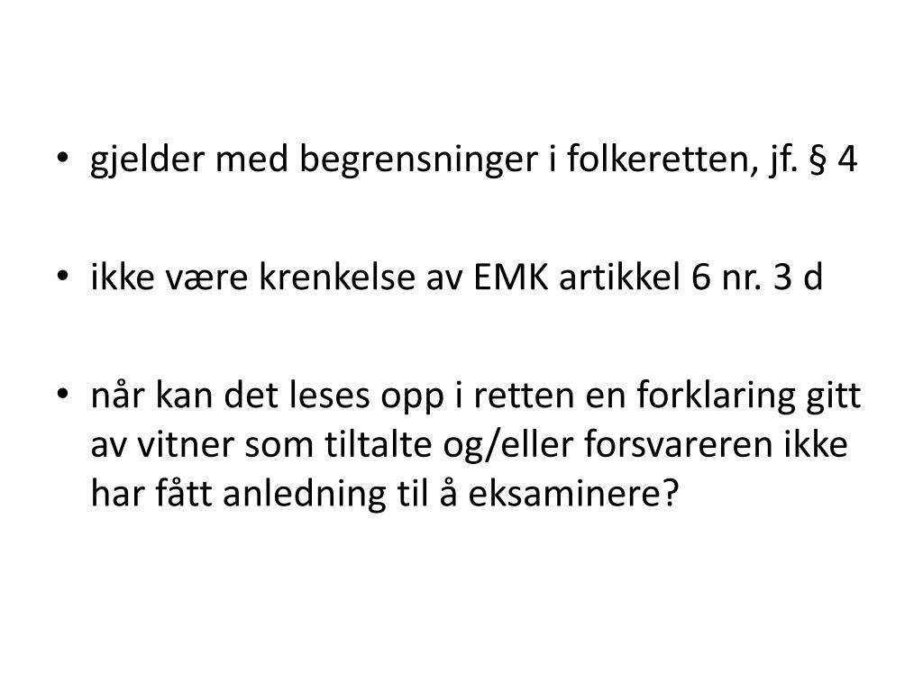 gjelder med begrensninger i folkeretten, jf. § 4 • ikke være krenkelse av EMK artikkel 6 nr. 3 d • når kan det leses opp i retten en forklaring gitt av vitner som tiltalte og/eller forsvareren ikke har fått anledning til å eksaminere?