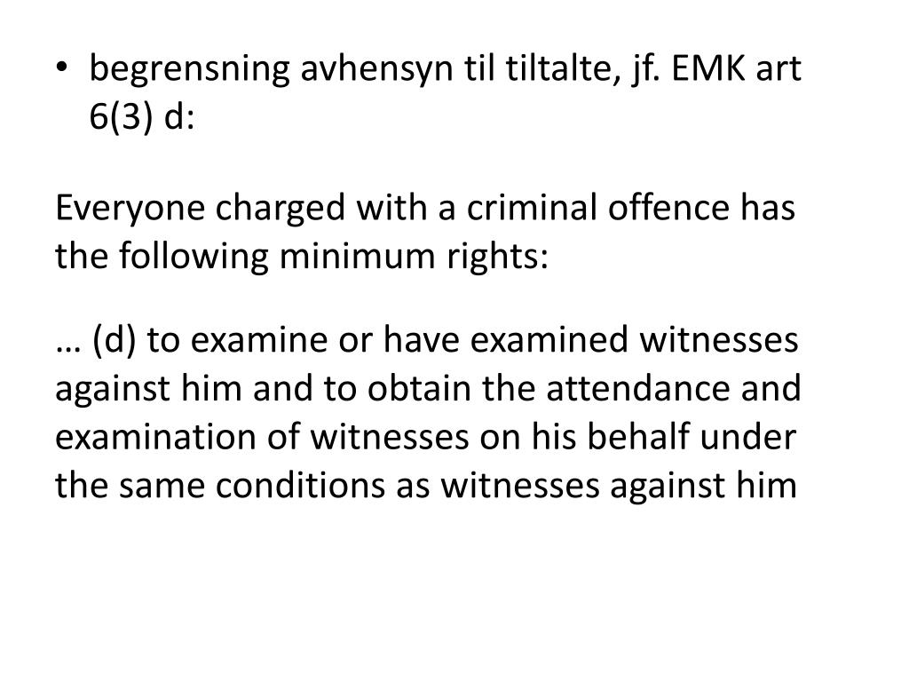 begrensning avhensyn til tiltalte, jf. EMK art 6(3) d: Everyone charged with a criminal offence has the following minimum rights: … (d) to examine or have examined witnesses against him and to obtain the attendance and examination of witnesses on his behalf under the same conditions as witnesses against him