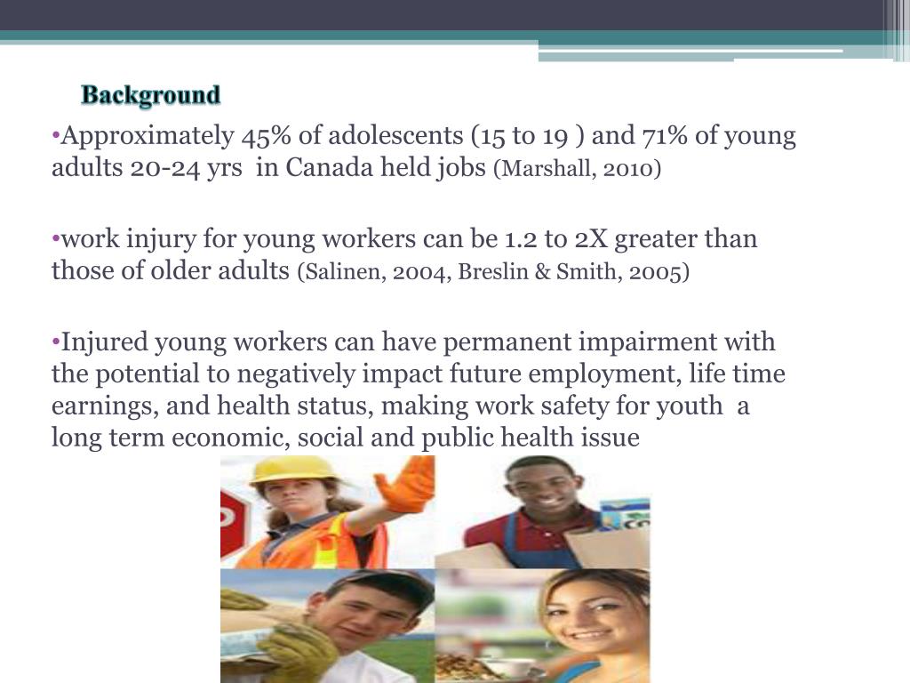 Background Approximately 45% of adolescents (15 to 19 ) and 71% of young adults 20-24 yrs in Canada held jobs (Marshall, 2010) work injury for young workers can be 1.2 to 2X greater than those of older adults (Salinen, 2004, Breslin & Smith, 2005) Injured young workers can have permanent impairment with the potential to negatively impact future employment, life time earnings, and health status, making work safety for youth a long term economic, social and public health issue