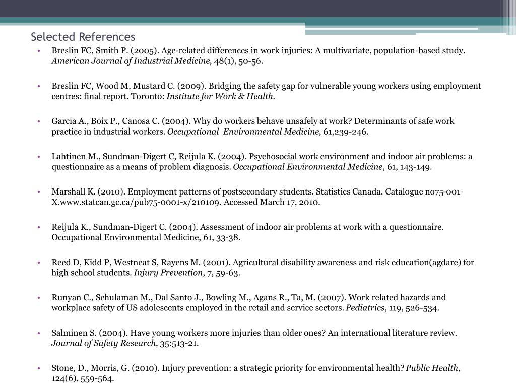 Selected References • Breslin FC, Smith P. (2005). Age-related differences in work injuries: A multivariate, population-based study. American Journal of Industrial Medicine, 48(1), 50-56. • Breslin FC, Wood M, Mustard C. (2009). Bridging the safety gap for vulnerable young workers using employment centres: final report. Toronto: Institute for Work & Health. • Garcia A., Boix P., Canosa C. (2004). Why do workers behave unsafely at work? Determinants of safe work practice in industrial workers. Occupational Environmental Medicine, 61,239-246. • Lahtinen M., Sundman-Digert C, Reijula K. (2004). Psychosocial work environment and indoor air problems: a questionnaire as a means of problem diagnosis. Occupational Environmental Medicine, 61, 143-149. • Marshall K. (2010). Employment patterns of postsecondary students. Statistics Canada. Catalogue no75-001-X.www.statcan.gc.ca/pub75-0001-x/210109. Accessed March 17, 2010. • Reijula K., Sundman-Digert C. (2004). Assessment of indoor air problems at work with a questionnaire. Occupational Environmental Medicine, 61, 33-38. • Reed D, Kidd P, Westneat S, Rayens M. (2001). Agricultural disability awareness and risk education(agdare) for high school students. Injury Prevention, 7, 59-63. • Runyan C., Schulaman M., Dal Santo J., Bowling M., Agans R., Ta, M. (2007). Work related hazards and workplace safety of US adolescents employed in the retail and service sectors. Pediatrics, 119, 526-534. • Salminen S. (2004). Have young workers more injuries than older ones? An international literature review. Journal of Safety Research, 35:513-21. • Stone, D., Morris, G. (2010). Injury prevention: a strategic priority for environmental health? Public Health, 124(6), 559-564.