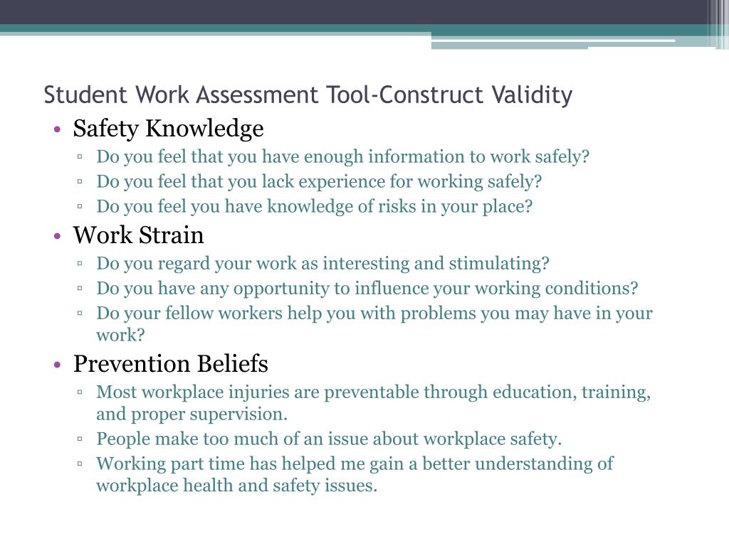 Student Work Assessment Tool-Construct Validity • Safety Knowledge • Do you feel that you have enough information to work safely? • Do you feel that you lack experience for working safely? • Do you feel you have knowledge of risks in your place? • Work Strain • Do you regard your work as interesting and stimulating? • Do you have any opportunity to influence your working conditions? • Do your fellow workers help you with problems you may have in your work? • Prevention Beliefs • Most workplace injuries are preventable through education, training, and proper supervision. • People make too much of an issue about workplace safety. • Working part time has helped me gain a better understanding of workplace health and safety issues.