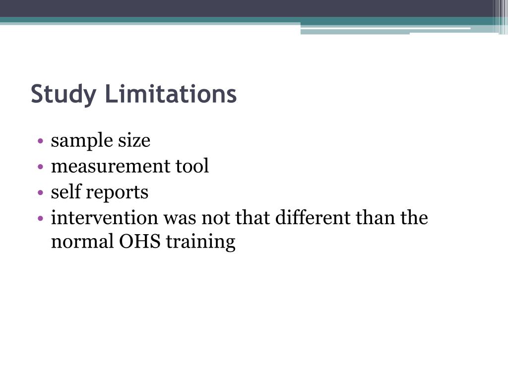 Study Limitations • sample size • measurement tool • self reports • intervention was not that different than the normal OHS training