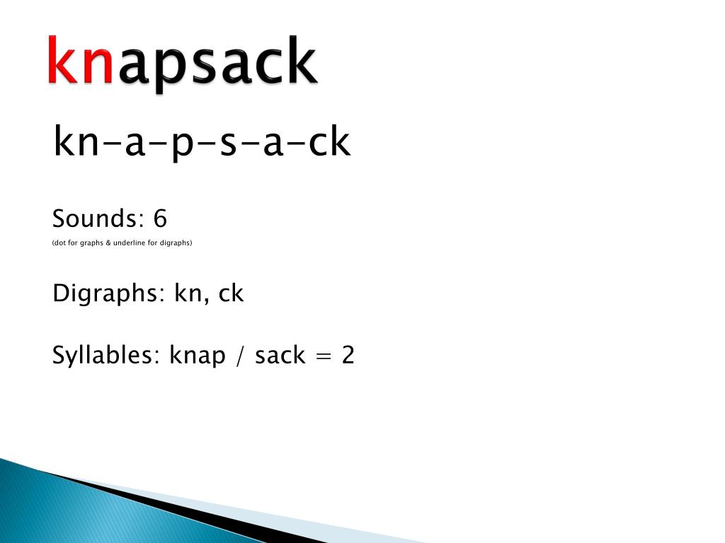 knapsack kn-a-p-s-a-ck Sounds: 6 (dot for graphs & underline for digraphs) Digraphs: kn, ck Syllables: knap / sack= 2