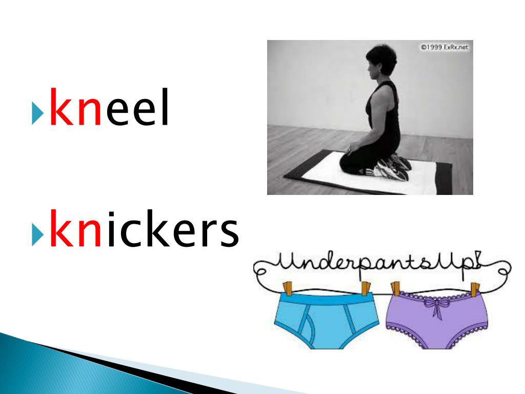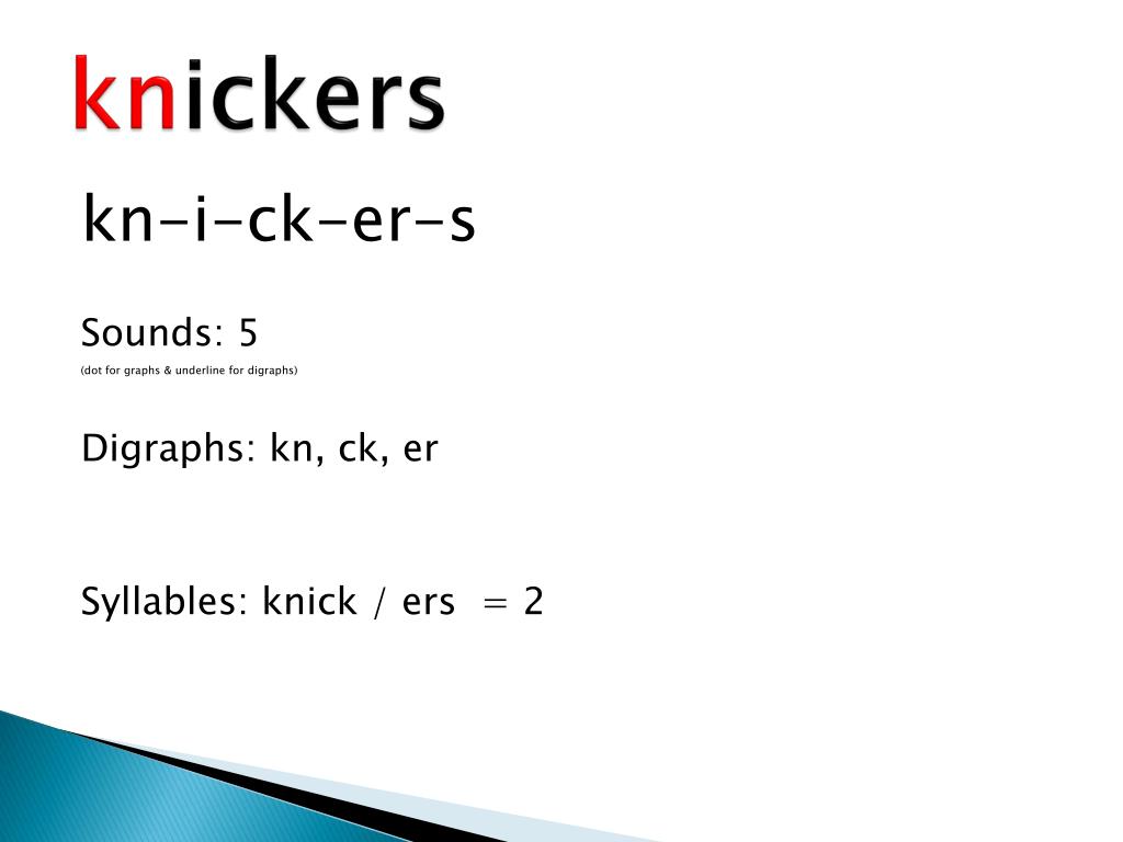 knickers kn-i-ck-er-s Sounds: 5 (dot for graphs & underline for digraphs) Digraphs: kn, ck, er Syllables: knick/ ers= 2