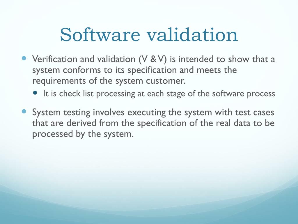 Software validation • Verification and validation (V & V) is intended to show that a system conforms to its specification and meets the requirements of the system customer. • It is check list processing at each stage of the software process • System testing involves executing the system with test cases that are derived from the specification of the real data to be processed by the system.