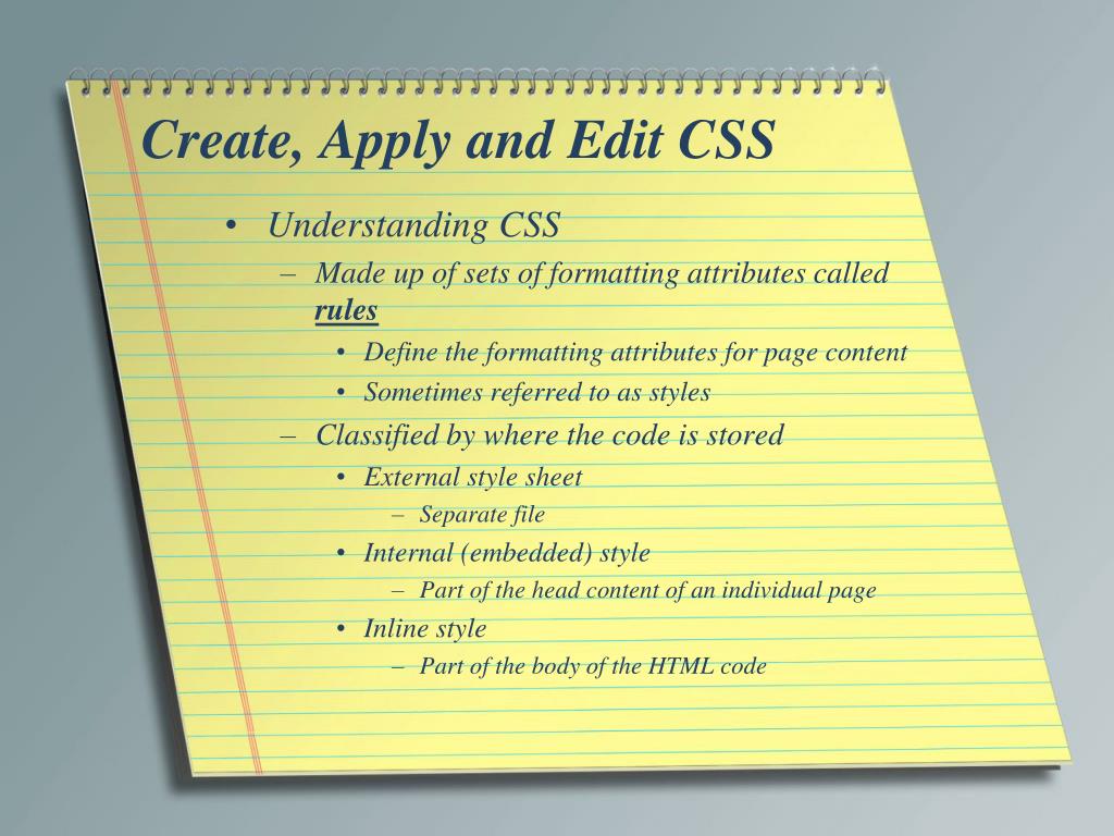 Create, Apply and Edit CSS • Understanding CSS • Made up of sets of formatting attributes called rules • Define the formatting attributes for page content • Sometimes referred to as styles • Classified by where the code is stored • External style sheet • Separate file • Internal (embedded) style • Part of the head content of an individual page • Inline style • Part of the body of the HTML code