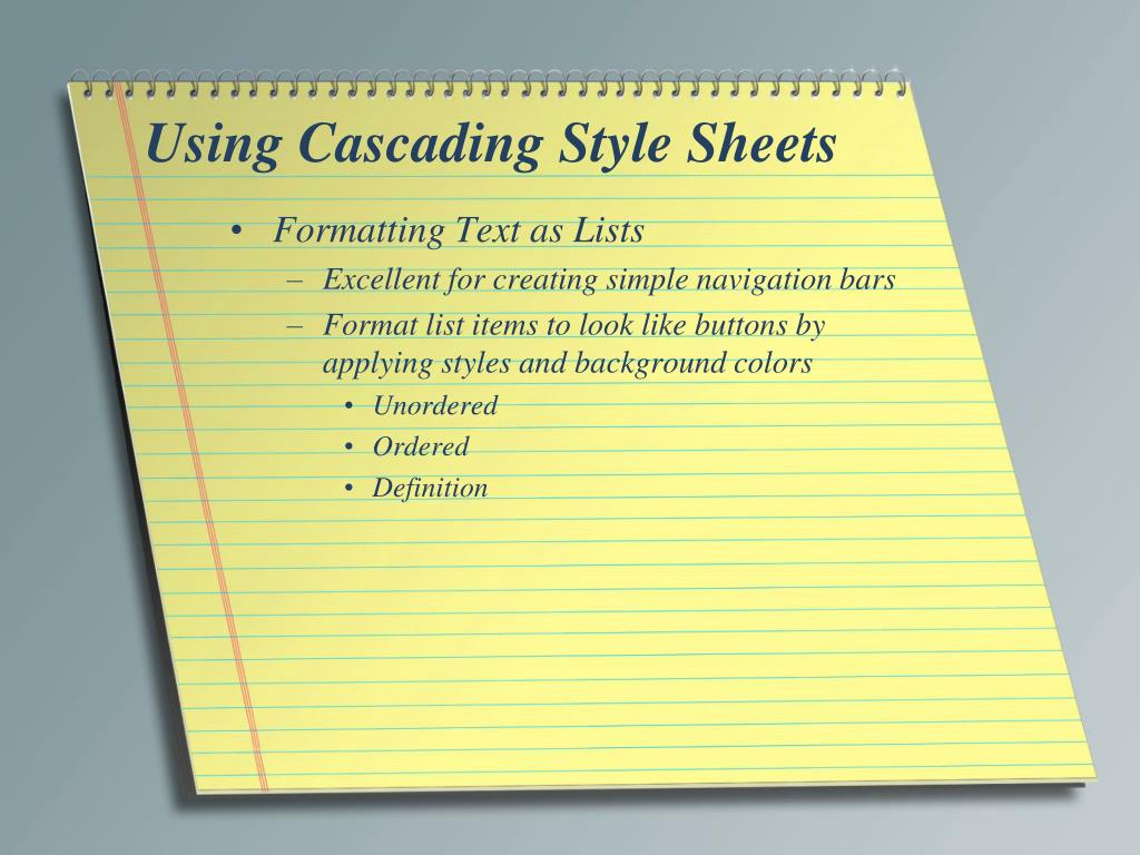 Using Cascading Style Sheets • Formatting Text as Lists • Excellent for creating simple navigation bars • Format list items to look like buttons by applying styles and background colors • Unordered • Ordered • Definition