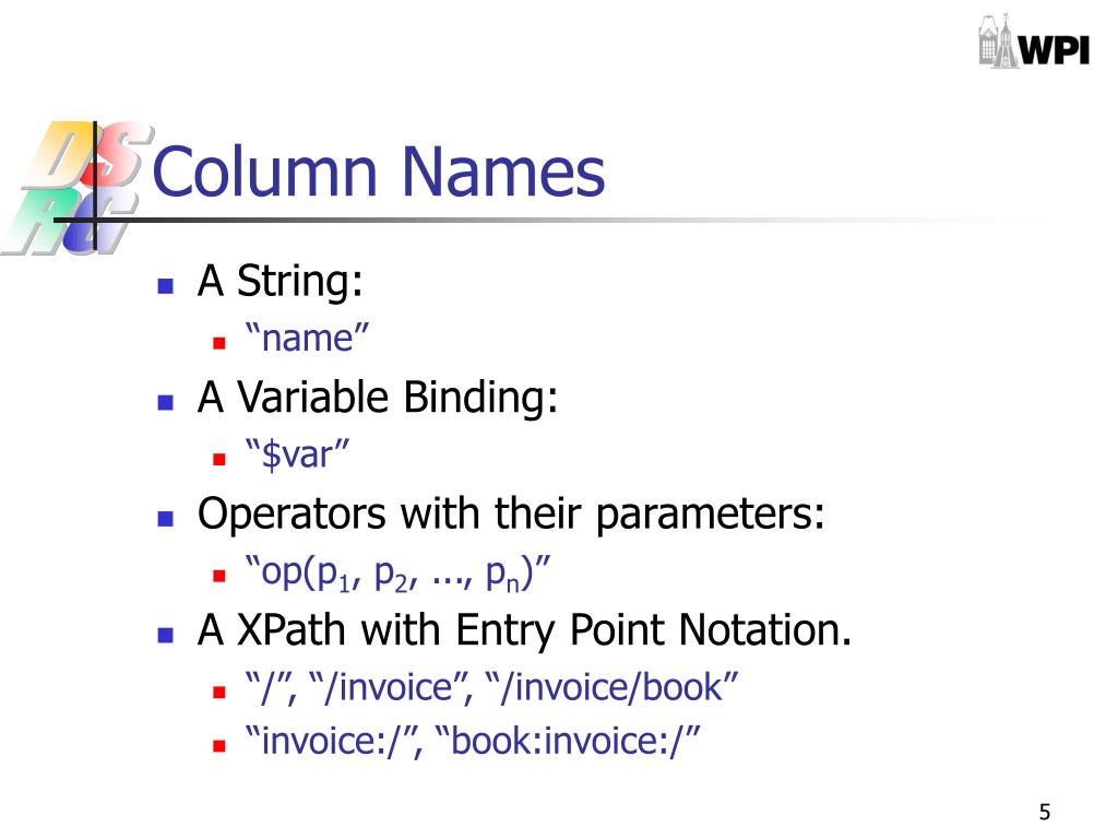 Column Names • A String: • “name” • A Variable Binding: • “$var” • Operators with their parameters: • “op(p1, p2, ..., pn)” • A XPath with Entry Point Notation. • “/”, “/invoice”, “/invoice/book” • “invoice:/”, “book:invoice:/”