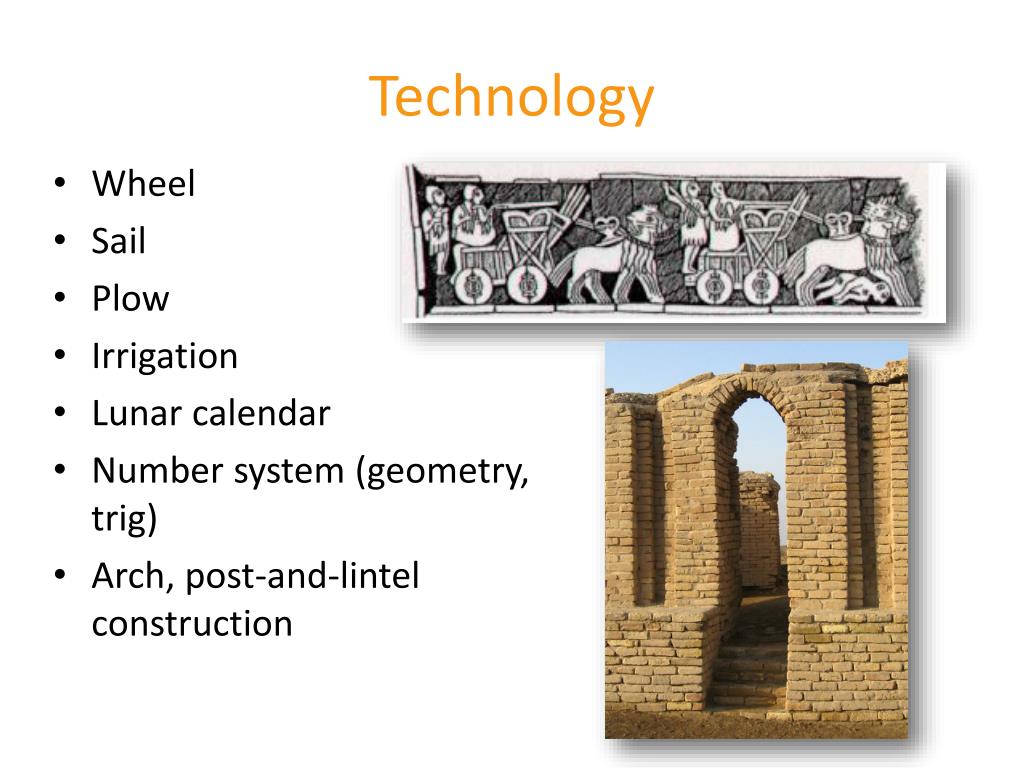 Technology • Wheel • Sail • Plow • Irrigation • Lunar calendar • Number system (geometry, trig) • Arch, post-and-lintel construction