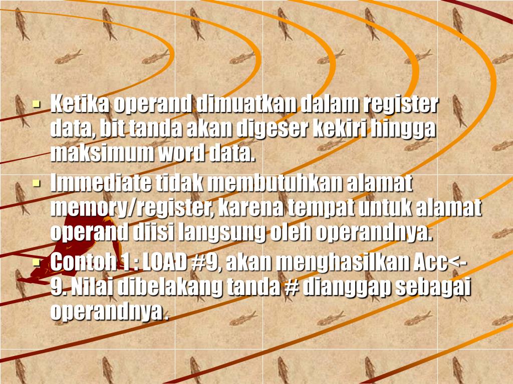 Ketika operand dimuatkan dalam register data, bit tanda akan digeser kekiri hingga maksimum word data. • Immediate tidak membutuhkan alamat memory/register, karena tempat untuk alamat operand diisi langsung oleh operandnya. • Contoh 1 : LOAD #9, akan menghasilkan Acc<-9. Nilai dibelakang tanda # dianggap sebagai operandnya.