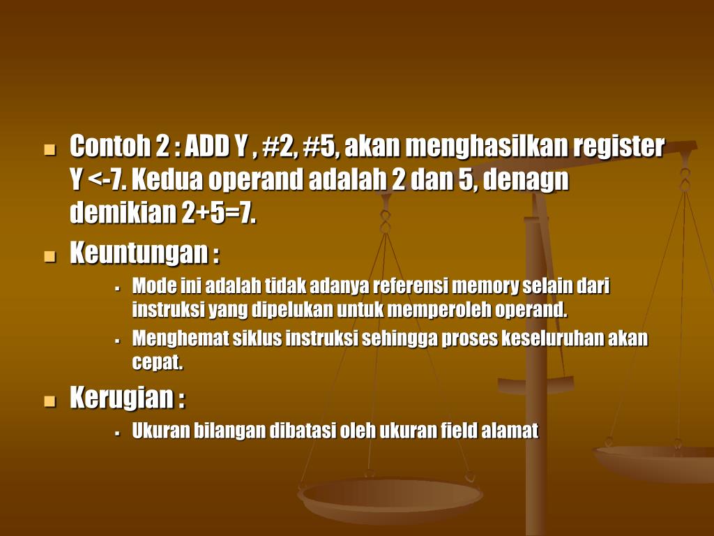 Contoh 2 : ADD Y , #2, #5, akan menghasilkan register Y <-7. Kedua operand adalah 2 dan 5, denagn demikian 2+5=7. • Keuntungan : • Mode ini adalah tidak adanya referensi memory selain dari instruksi yang dipelukan untuk memperoleh operand. • Menghemat siklus instruksi sehingga proses keseluruhan akan cepat. • Kerugian : • Ukuran bilangan dibatasi oleh ukuran field alamat