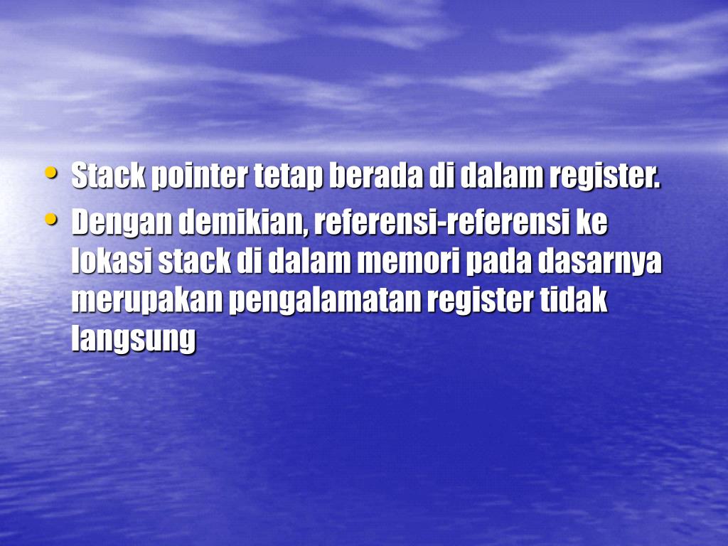 Stack pointer tetap berada di dalam register. • Dengan demikian, referensi-referensi ke lokasi stack di dalam memori pada dasarnya merupakan pengalamatan register tidak langsung