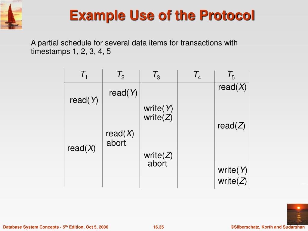 A partial schedule for several data items for transactions with timestamps 1, 2, 3, 4, 5 Example Use of the Protocol T1 T2 T3 T4 T5 read(X) read(Y) read(Y) write(Y) write(Z) read(Z) read(X) abort read(X) write(Z) abort write(Y) write(Z)