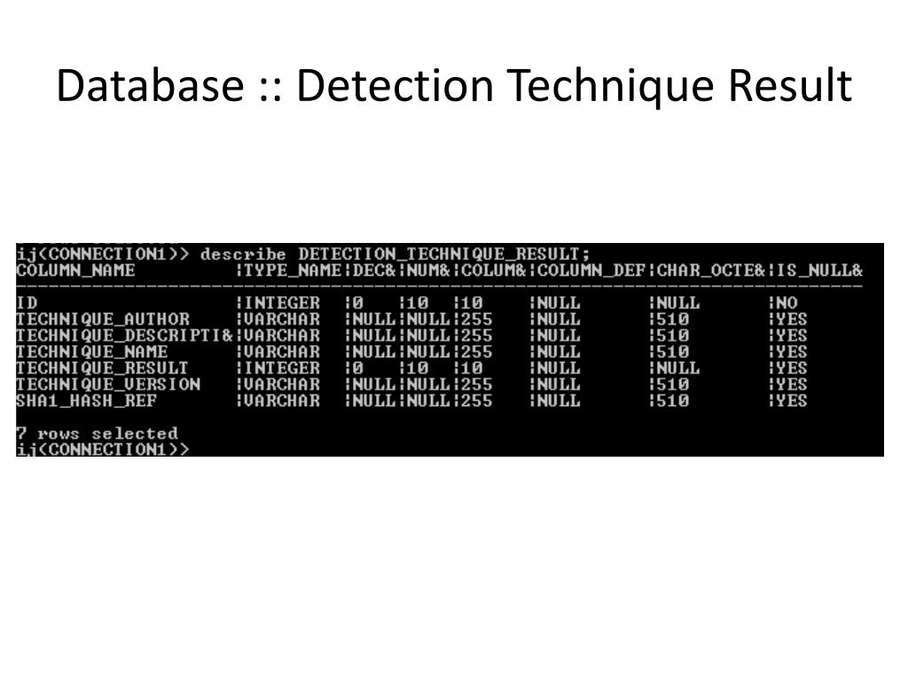 Design :: Database • Used to store results of files that have been processed • Efficient since duplicate files don’t need to be reprocessed • Dirty flag is enabled when plugins change which will require reprocessing • DetectionResponse class is annotated as an Entity that maps to the database schema • Allows for injection of persistence context and easily persist/retrieve results