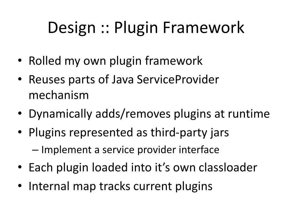 Design :: Plugin Framework • Rolled my own plugin framework • Reuses parts of Java ServiceProvider mechanism • Dynamically adds/removes plugins at runtime • Plugins represented as third-party jars • Implement a service provider interface • Each plugin loaded into it’s own classloader • Internal map tracks current plugins