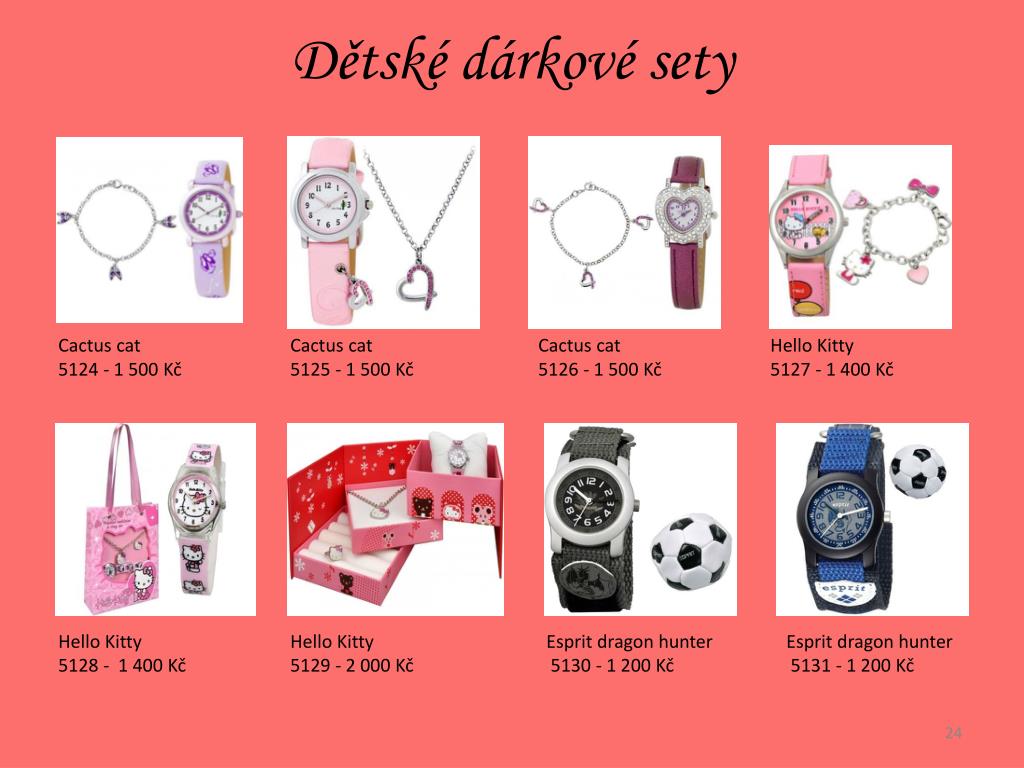 Klasické dětské hodinky Puma 5100 - 3 000 Kč Michael Kors 5101 – 5 000 Kč Tissot 5102 - 19 000 Kč Esprit romance 5103 - 1 100 Kč HelloKitty 5104 - 1 400 Kč HelloKitty 5105 - 1 400 Kč HelloKitty 5106 - 1 500 Kč HelloKitty 5107 - 2 100 Kč