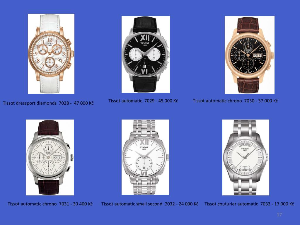 Tissotautomatic 7029 - 45 000 Kč Tissotautomaticchrono 7030 - 37 000 Kč Tissotdressportdiamonds 7028 - 47 000 Kč Tissotautomaticchrono 7031 - 30 400 Kč Tissotautomaticsmallsecond 7032 - 24 000 Kč Tissotcouturierautomatic 7033 - 17 000 Kč