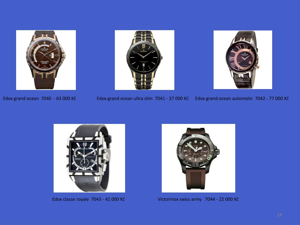 Edox grand ocean 7040 - 63 000 Kč Edox grand ocean ultra slim 7041 - 37 000 Kč Edox grand oceanautomatic 7042 - 77 000 Kč Edoxclasseroyale 7043 - 42 000 Kč Victorinoxswissarmy 7044 - 22 000 Kč