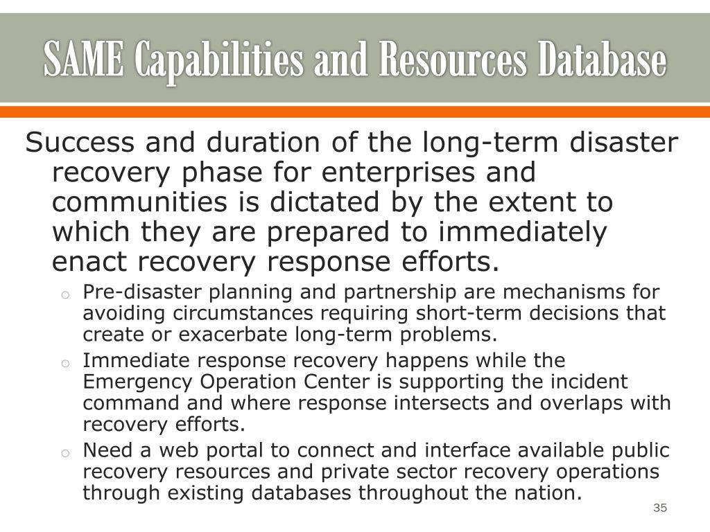 SAME Capabilities and Resources Database Success and duration of the long-term disaster recovery phase for enterprises and communities is dictated by the extent to which they are prepared to immediately enact recovery response efforts. • Pre-disaster planning and partnership are mechanisms for avoiding circumstances requiring short-term decisions that create or exacerbate long-term problems. • Immediate response recovery happens while the Emergency Operation Center is supporting the incident command and where response intersects and overlaps with recovery efforts. • Need a web portal to connect and interface available public recovery resources and private sector recovery operations through existing databases throughout the nation.