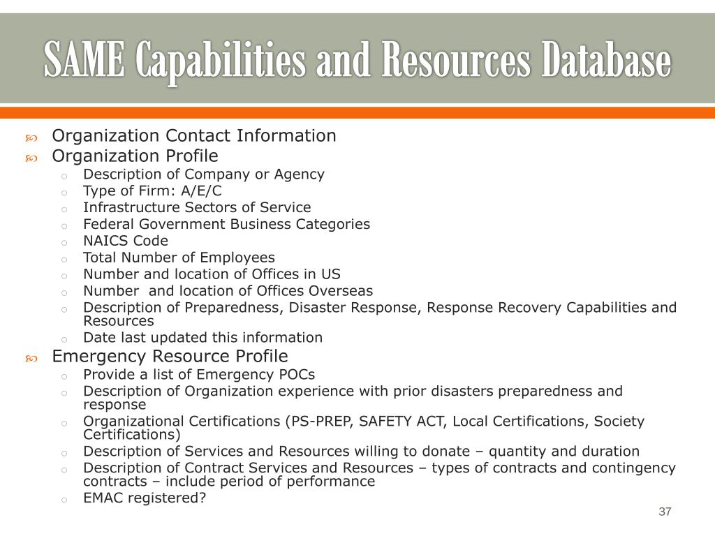 SAME Capabilities and Resources Database • Organization Contact Information • Organization Profile • Description of Company or Agency • Type of Firm: A/E/C • Infrastructure Sectors of Service • Federal Government Business Categories • NAICS Code • Total Number of Employees • Number and location of Offices in US • Number and location of Offices Overseas • Description of Preparedness, Disaster Response, Response Recovery Capabilities and Resources • Date last updated this information • Emergency Resource Profile • Provide a list of Emergency POCs • Description of Organization experience with prior disasters preparedness and response • Organizational Certifications (PS-PREP, SAFETY ACT, Local Certifications, Society Certifications) • Description of Services and Resources willing to donate – quantity and duration • Description of Contract Services and Resources – types of contracts and contingency contracts – include period of performance • EMAC registered?