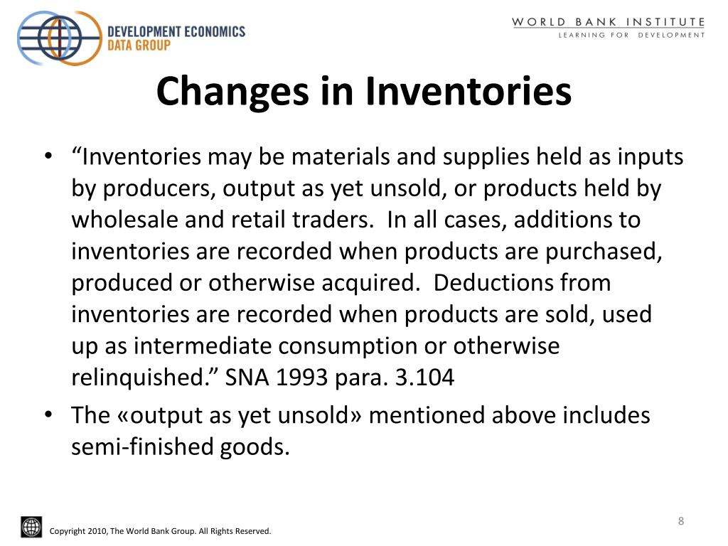 Changes in Inventories • “Inventories may be materials and supplies held as inputs by producers, output as yet unsold, or products held by wholesale and retail traders. In all cases, additions to inventories are recorded when products are purchased, produced or otherwise acquired. Deductions from inventories are recorded when products are sold, used up as intermediate consumption or otherwise relinquished.” SNA 1993 para. 3.104 • The «output as yet unsold» mentioned above includes semi-finished goods.