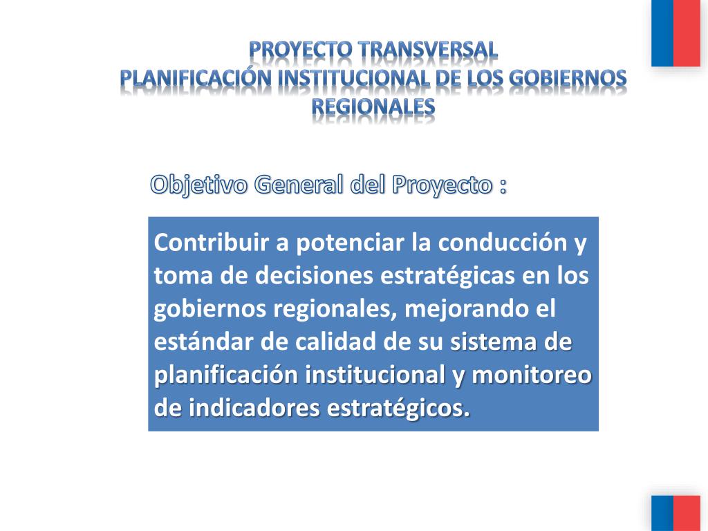 Proyecto Transversal Planificación Institucional de los Gobiernos Regionales Objetivo General del Proyecto :