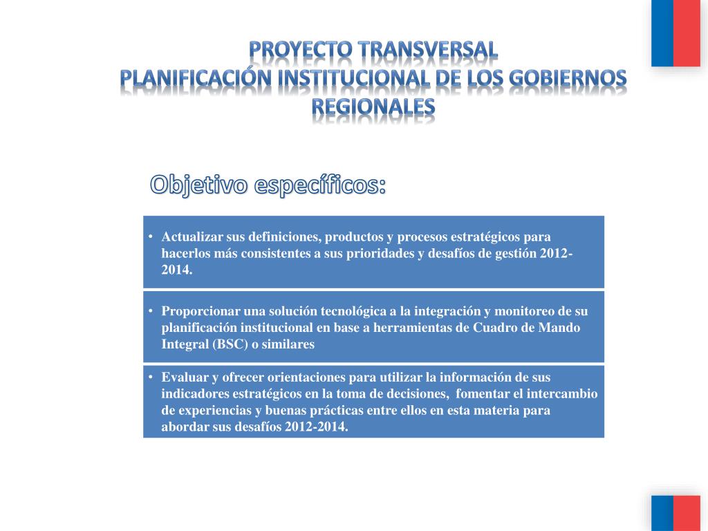Proyecto Transversal Planificación Institucional de los Gobiernos Regionales Objetivo específicos: