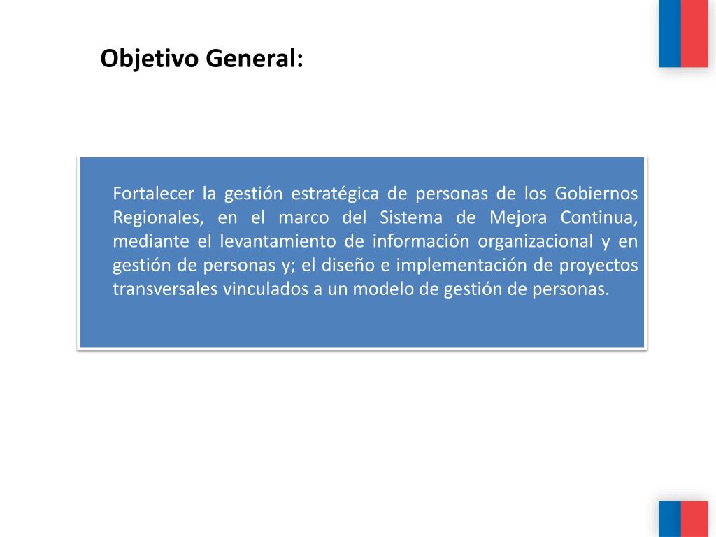Objetivo General: Fortalecer la gestión estratégica de personas de los Gobiernos Regionales, en el marco del Sistema de Mejora Continua, mediante el levantamiento de información organizacional y en gestión de personas y; el diseño e implementación de proyectos transversales vinculados a un modelo de gestión de personas.