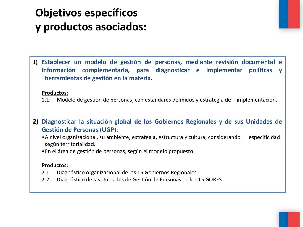 Objetivos específicos y productos asociados: 1)Establecer un modelo de gestión de personas, mediante revisión documental e información complementaria, para diagnosticar e implementar políticas y herramientas de gestión en la materia. Productos: 1.1. Modelo de gestión de personas, con estándares definidos y estrategia de implementación. 2)Diagnosticar la situación global de los Gobiernos Regionales y de sus Unidades de Gestión de Personas (UGP): • A nivel organizacional, su ambiente, estrategia, estructura y cultura, considerando especificidad según territorialidad. • En el área de gestión de personas, según el modelo propuesto. Productos: 2.1. Diagnóstico organizacional de los 15 Gobiernos Regionales. 2.2. Diagnóstico de las Unidades de Gestión de Personas de los 15 GORES.