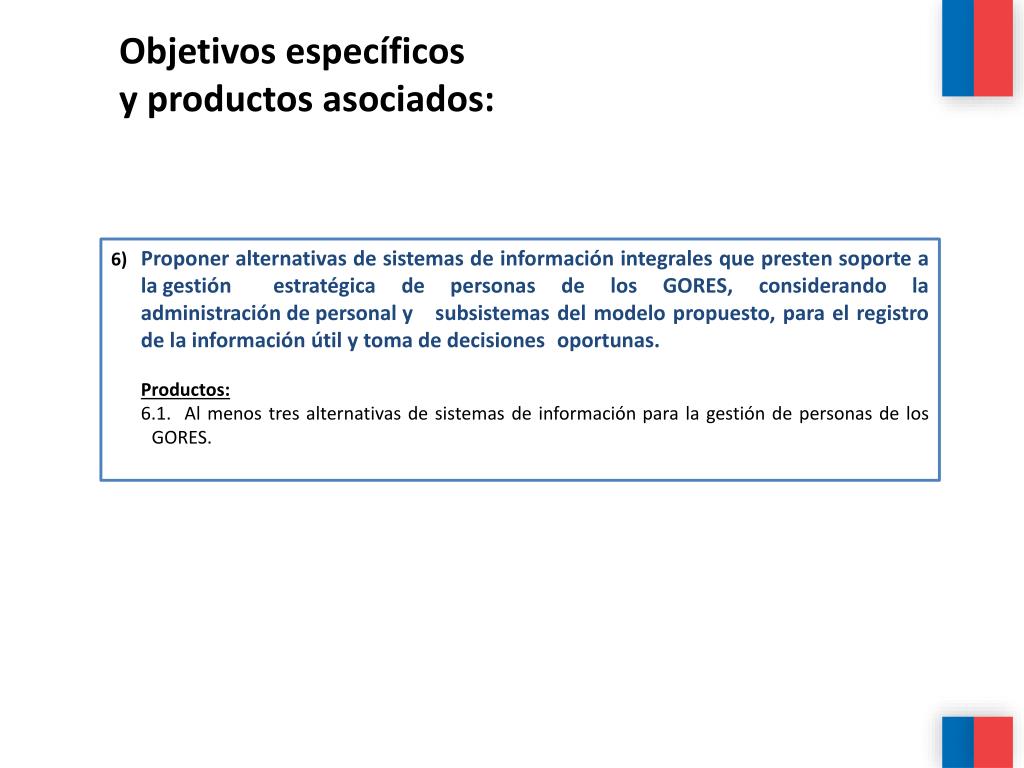 Objetivos específicos y productos asociados: 6)Proponer alternativas de sistemas de información integrales que presten soporte a la gestión estratégica de personas de los GORES, considerando la administración de personal y subsistemas del modelo propuesto, para el registro de la información útil y toma de decisiones oportunas. Productos: 6.1. Al menos tres alternativas de sistemas de información para la gestión de personas de los GORES.