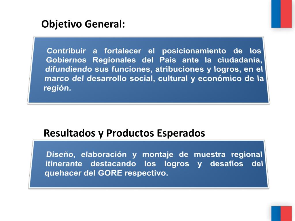Objetivo General: Contribuir a fortalecer el posicionamiento de los Gobiernos Regionales del País ante la ciudadanía, difundiendo sus funciones, atribuciones y logros, en el marco del desarrollo social, cultural y económico de la región. Resultados y Productos Esperados Diseño, elaboración y montaje de muestra regional itinerante destacando los logros y desafíos del quehacer del GORE respectivo.