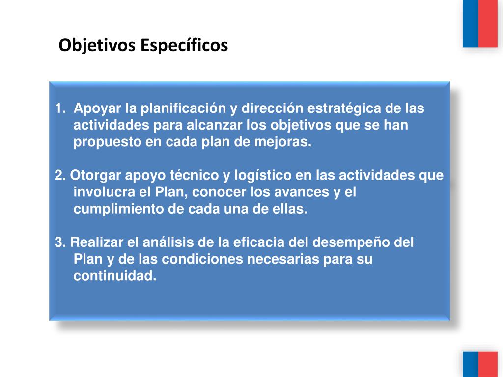 Objetivos Específicos 1. Apoyar la planificación y dirección estratégica de las actividades para alcanzar los objetivos que se han propuesto en cada plan de mejoras. 2. Otorgar apoyo técnico y logístico en las actividades que involucra el Plan, conocer los avances y el cumplimiento de cada una de ellas. 3. Realizar el análisis de la eficacia del desempeño del Plan y de las condiciones necesarias para su continuidad.