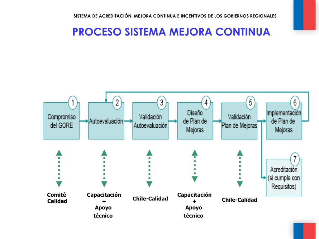PROCESO SISTEMA MEJORA CONTINUA SISTEMA DE ACREDITACIÓN, MEJORA CONTINUA E INCENTIVOS DE LOS GOBIERNOS REGIONALES Chile-Calidad Comité Calidad Capacitación + Apoyo técnico Capacitación + Apoyo técnico Chile-Calidad