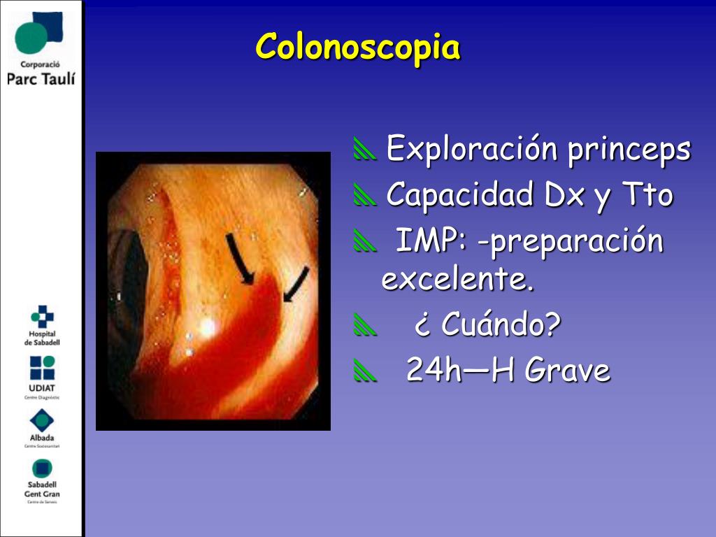 Colonoscopia • Exploración princeps • Capacidad Dx y Tto • IMP: -preparación excelente. • ¿ Cuándo? • 24h—H Grave